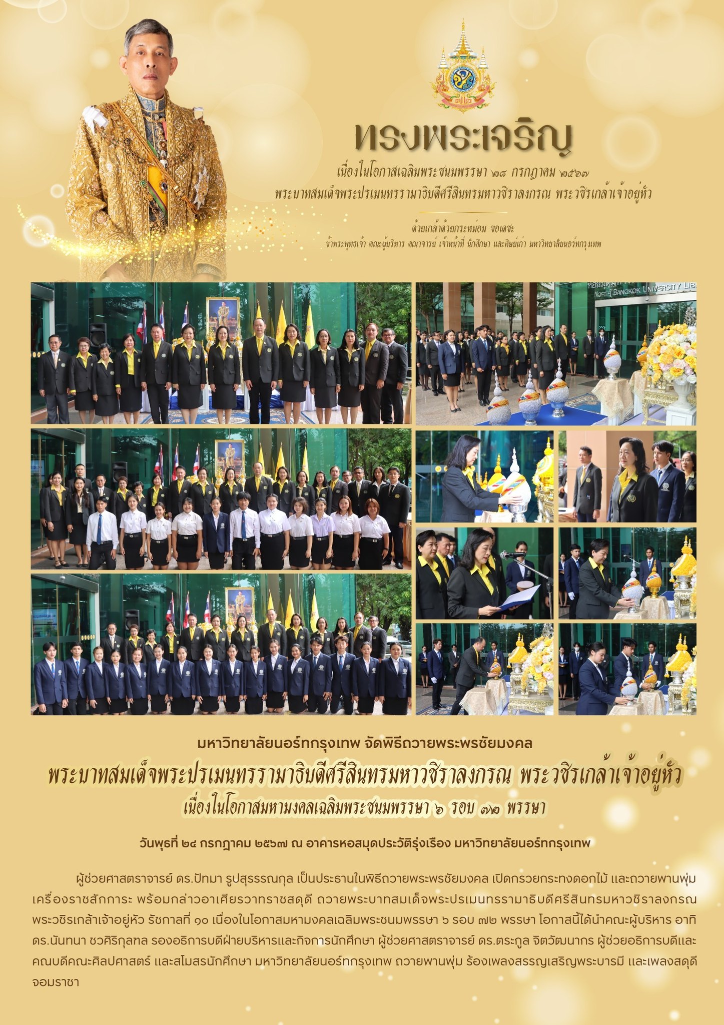 มหาวิทยาลัยนอร์ทกรุงเทพ จัดพิธีถวายพระพรชัยมงคล พระบาทสมเด็จพระปรเมนทรรามาธิบดีศรีสินทรมหาวชิราลงกรณ พระวชิรเกล้าเจ้าอยู่หัว เนื่องในโอกาสมหามงคลเฉลิมพระชนมพรรษา ๖ รอบ ๗๒ พรรษา วันพุธที่ ๒๔ กรกฎาคม ๒๕๖๗ ณ อาคารหอสมุดประวัติรุ่งเรือง มหาวิทยาลัยนอร์ทกรุงเทพ