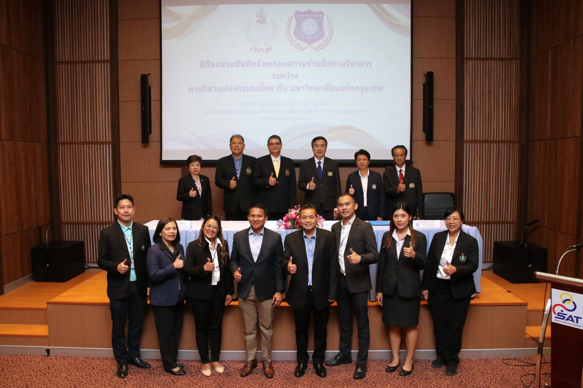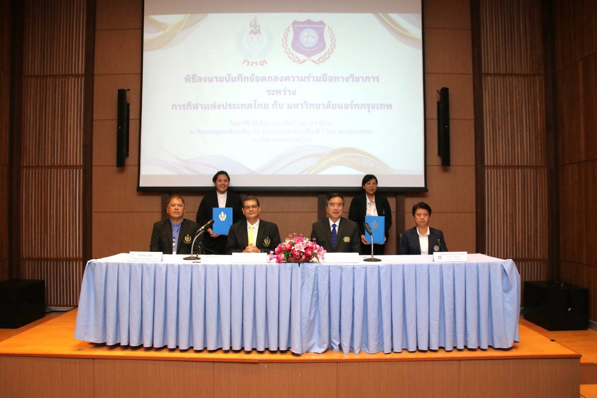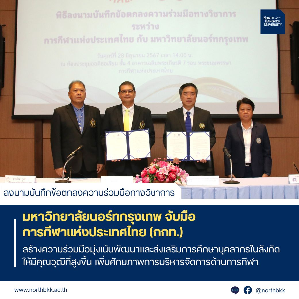 ผู้ช่วยศาสตราจารย์ ดร.สิทธิพร ประวัติรุ่งเรือง อธิการบดีมหาวิทยาลัยนอร์ทกรุงเทพ และ นายแพทย์ มีชัย อินวู๊ด รองผู้ว่าการฝ่ายบริหาร ผู้แทน ดร.ก้องศักด ยอดมณี ผู้ว่าการการกีฬาแห่งประเทศไทย ร่วมลงนามในพิธีลงนามบันทึกข้อตกลงความร่วมมือทางวิชาการ ระหว่าง มหาวิทยาลัยนอร์ทกรุงเทพ กับ การกีฬาแห่งประเทศไทย (กกท.) เพื่อร่วมกันพัฒนาและส่งเสริมการศึกษาให้กับบุคลากรในสังกัดการกีฬาแห่งประเทศไทย (กกท.) ให้มีคุณวุฒิที่สูงขึ้น รองรับการเติบโตทางด้านการกีฬามนอนาคต โดยม่งเน้นส่งเสริมให้บุคลากรได้ศึกษาในหลักสูตรที่เกี่ยวข้องกับด้านการบริหารจัดการดีฬา อาทิเช่น หลักสูตรปรัชญาดุษฎีบัณฑิต (Ph.D.) สาขาพลศึกษา กีฬา และนันทนาการ, หลักสูตรศิลปศาสตร์มหาบัณฑิต สาขาพลศึกษา กีฬา และนันทนาการ สาขาการจัดการ และสาขาอื่นๆที่เกี่ยวข้อง