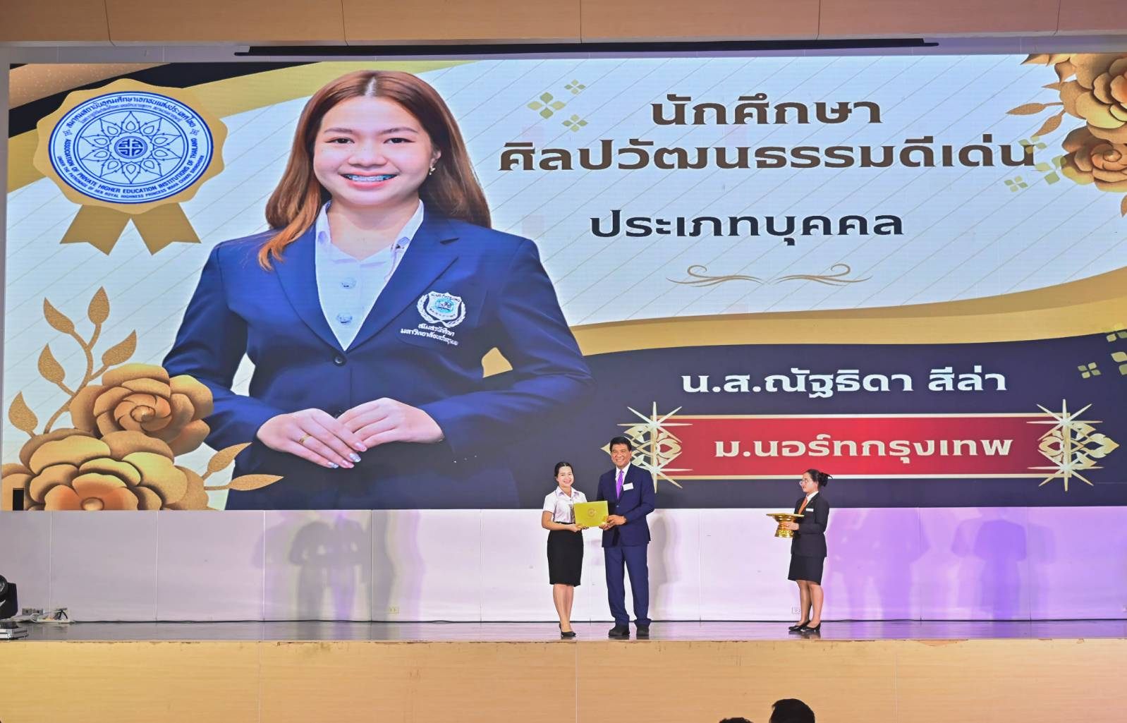 นางสาวณัฐธิดา สีล่า นักศึกษาสาขาการจัดการงานอีเวนต์ นิทรรศการและการประชุม คณะศิลปศาสตร์ มหาวิทยาลัยนอร์ทกรุงเทพ ชั้นปีที่ 4 ได้รับรางวัลนักศึกษาดีเด่น ด้านศิลปวัฒนธรรม ประจำปีการศึกษา 2567