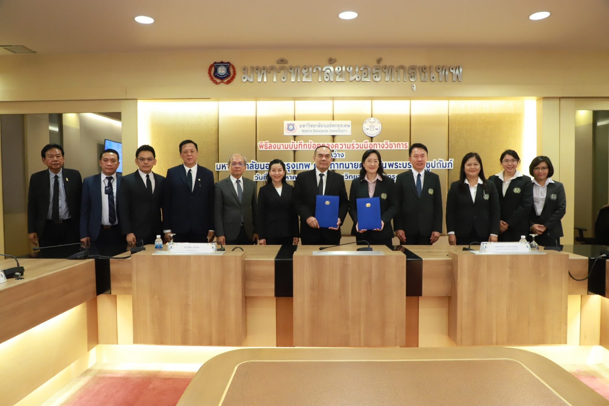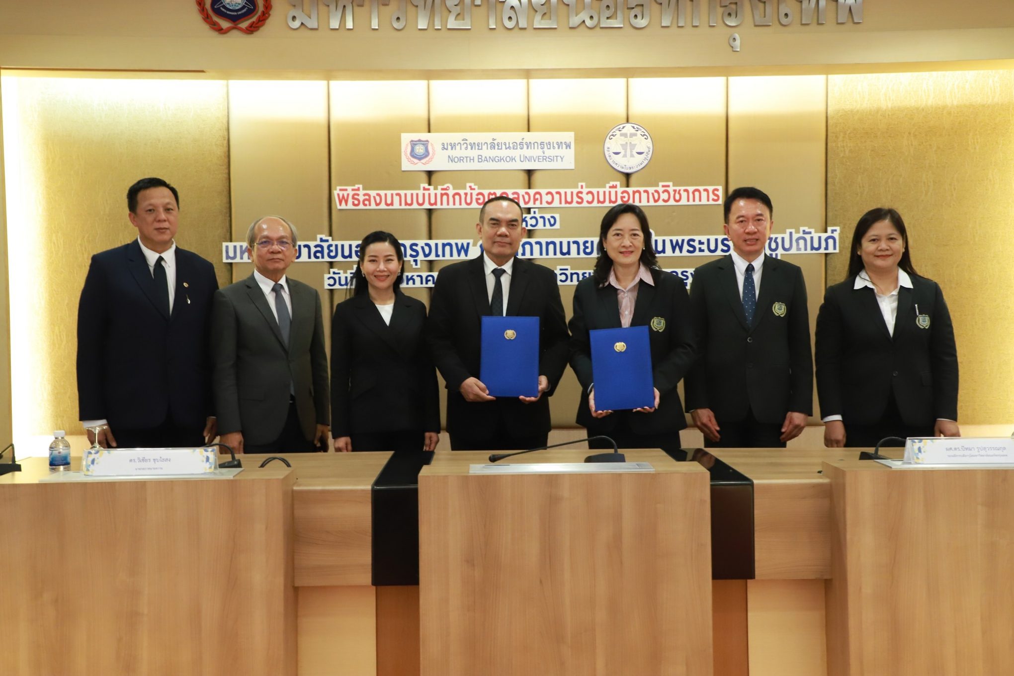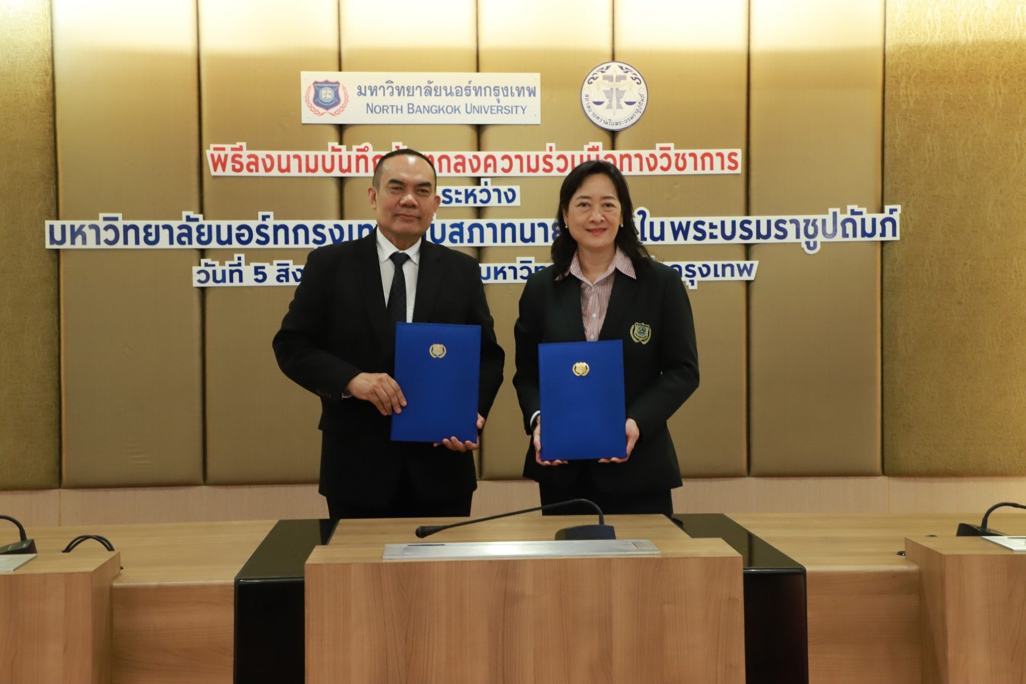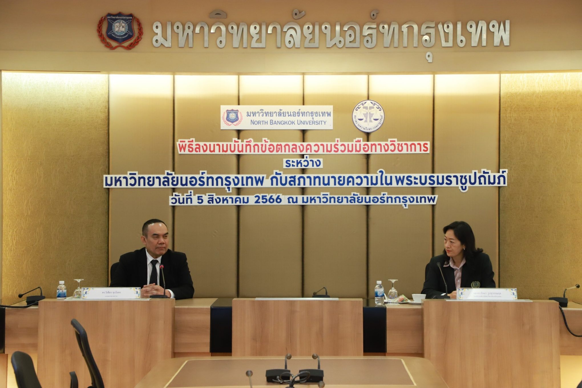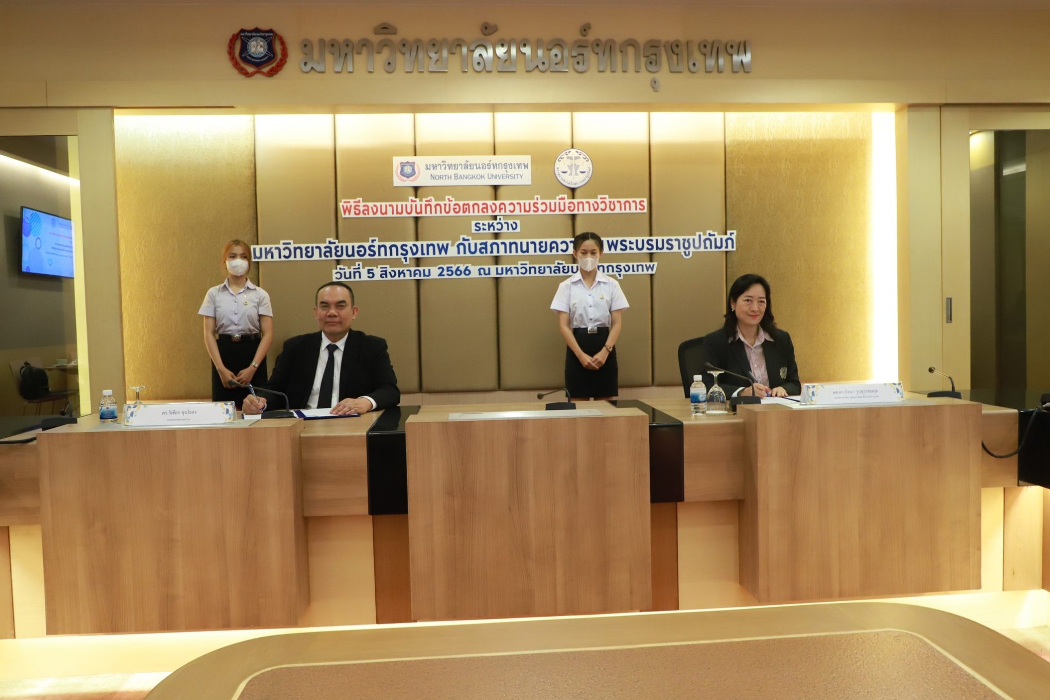 ผู้ช่วยศาสตราจารย์ ดร.ปัทมา รูปสุวรรณกุล รองอธิการบดีอาวุโส มหาวิทยาลัยนอร์ทกรุงเทพ และ ดร.วิเชียร ชุบไธสง นายกสภาทนายความในพระบรมราชูปถัมภ์ ร่วมลงนามบันทึกข้อตกลงความร่วมมือทางวิชาการ เพื่อส่งเสริมและสนับสนุนแลกเปลี่ยนทนายวิชาชีพในการจัดการศึกษาและให้คำปรึกษาทางด้านกฎหมายแก่นักศึกษา มหาวิทยาลัยนอร์ทกรุงเทพ และประชาชนในพื้นที่ใกล้เคียง และร่วมกันพัฒนางานวิชาการในประเด็นที่มีความน่าสนใจ รวมทั้งการพัฒนาความรู้ในหลักสูตรปริญญาตรี ปริญญาโท และปริญญาเอก ด้านต่างๆ พร้อมทั้งร่วมกันสนับสนุนและเสริมสร้างความร่วมมือในการจัดบริการวิชาการ การเรียนการสอน การวิจัยเพื่อพัฒนาชุมชนและสังคมต่อไป